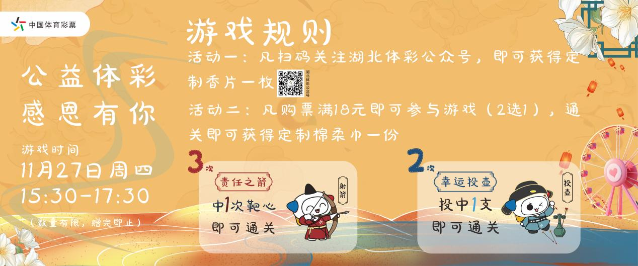 为落实“取之于民,用之于民”的发行宗旨,回馈广大市民长期以来的支持和关注,湖北省体育彩票管理中心将于11月27日(周四)15:30至17:30在武汉街街口地铁站举办“公益体育彩票,谢谢你”暖心回馈活动,诚邀各界人士参与互动!