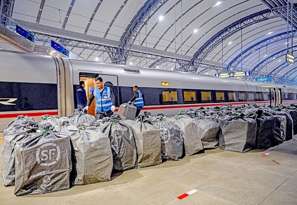 工作人员将表情的递送转移到高铁车厢上。摄影:楚天都市报·极目新闻记者 李辉 楚天都市报·极目新闻(记者潘喜恒 通讯员王琪 宋静)11月15日凌晨5时58分,DJ892次列车准时离开汉口火车站,前往广州白云站。这趟列车上,10吨的快递物品是唯一的“乘客”。这是铁道部首次试点使用全速动车组开展武汉至广州之间的快件运输。 15日凌晨5点左右,集目新闻记者在汉口站18号站台看到,衣物、生鲜、电子产品等包裹摆放有序,包装袋上印有“顺丰速运”、“京东速运”字样。附近的铁路轨道上,DJ892次高铁列车正在“等待”旅客。铁路工作人员迅速赶到将货物搬上车厢,整齐地堆放在座位上。 5时58分,DJ892次列车准时出发。当日4时38分,DJ890次列车从广州白云站出发前往汉口站。这是铁道部首次在武广高铁上进行批量货物运输试点。新增一条通往华中地区和粤港澳大湾区的高速物流通道。列车采用直达“点对点”模式,时速350公里,总运输时间约4.5小时,比公路运输快80%。中欧班列汉口站销售部经理张挺表示,高铁运输具有正点率高、运力大、全天候、绿色环保等优势。试点期间主要带来生鲜食品、急件、生物医药、电子产品等其他时效性要求高的高附加值商品。 “货物发往铁路干线后,可快速完成仓储中转和配送码头,形成‘高铁+仓网+码头’的全链路有效网络。”张婷说道。顺丰速运工作人员介绍,华中地区是电商订单的主要发货地,粤港澳大湾区是重要的消费市场。高铁的稳定性和准点性恰好符合正点要求。货物到达车站后,可直接连接至配送中心。整体接驳效率比航空运输高30%,让消费者更快收到来自中部地区的特产。京东物流工作人员表示,公司依靠这条线路,将货物从武汉“亚洲一号”快速配送至粤港澳大湾区的仓储节点。湾区实现“次日达”甚至“当日达”服务,构建一体化供应链网络。记者从铁道部门了解到,DJ车号是指动态检查车,用于高铁线路安全检查确认。该列车于高铁正式开通前黎明运行,整列列车不载客。使用满载动态检查车运送快递,可以充分发挥列车运输效率,同时又不影响其他列车的正常运行秩序。此前,中国已开通昆明至成都、郑州至重庆、南昌至深圳等主要高铁线路。武广高速高铁试点成功后,每周有4对线路同向运营。 上一篇:就在今天,我遇到了武汉的第一场雪