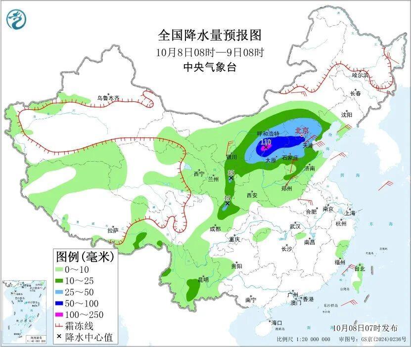 10月8日至9日,有中到大雨,四川盆地北部、甘肃东部、宁夏、陕西中北部、山西中北部、内蒙古中南部、京津冀等地局地大雨或大暴雨。