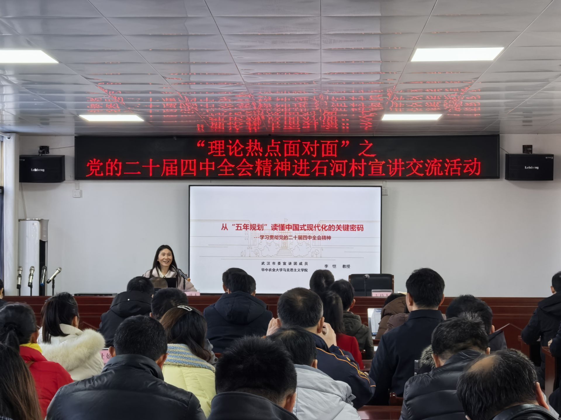 在新洲区三店街道石河村,李凯以“从‘五年规划’认识中国现代化基本密码”为主题,围绕“五个明确”,详细解读了《中共中央关于制定国民经济和社会发展第十五个五年规划的建议》。他动员与会人员积极学习贯彻党的二十届四中全会精神,以“十五五”规划为目标,锚定湖北省建设定位和武汉市发展目标,立足具体工作,为实现中国式现代化宏伟蓝图贡献力量。