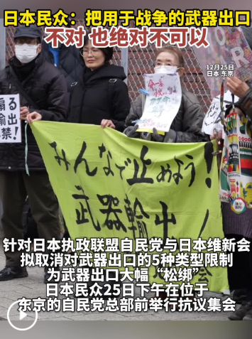 为回应日本执政的自民党联盟和日本改革会议计划取消五类武器出口限制并大幅“放松”武器出口,日本民众25日下午在东京自民党总部前举行抗议集会。